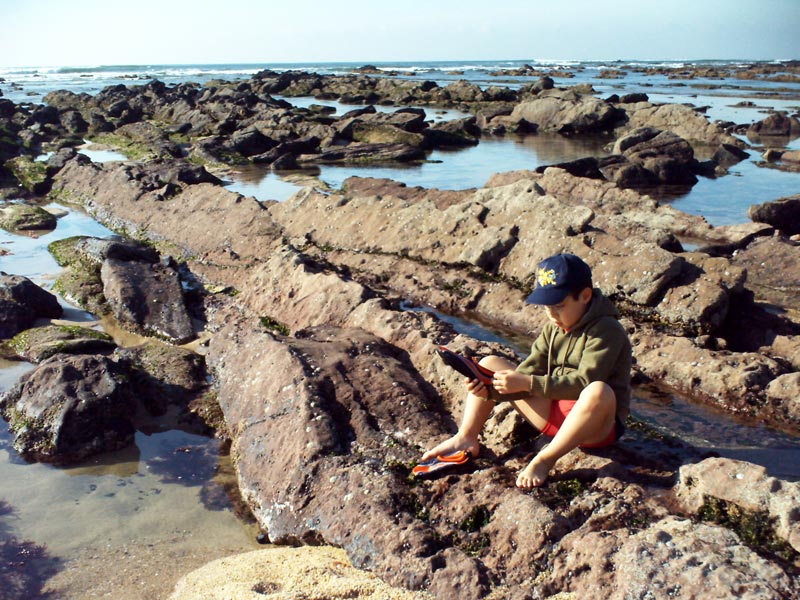 Apesar de estar sol quente o vento estava frio e a água nem se fala. O meu pequeno dono encontrou estrelas do mar e ouriços nas rochas e ao fundo havia mais de 20 surfistas a apanhar ondas, o que deve ser bem divertido!Mas eu prefiro ver só as fotos pois não gosto muito de água, nem do mar, nem da chuva. Só no banho que a minha dona me dá!